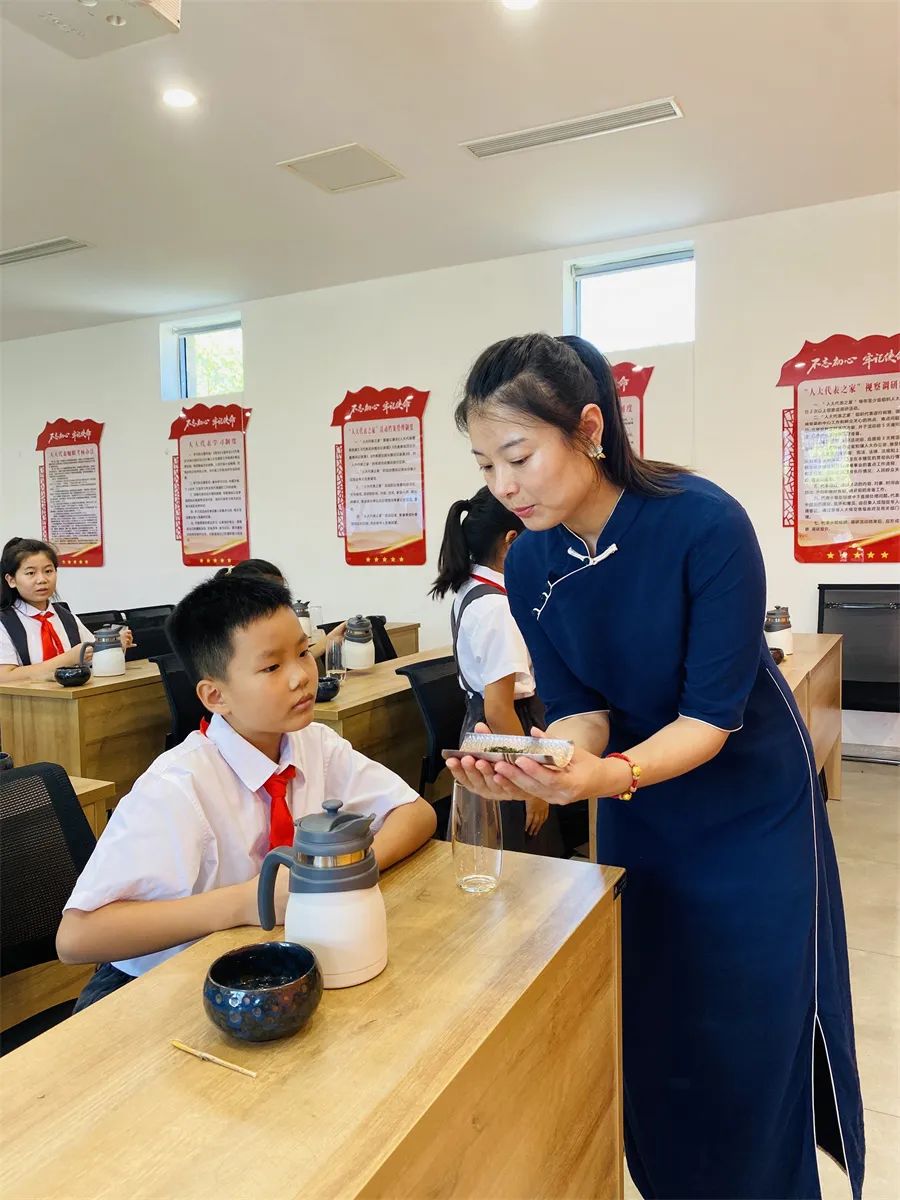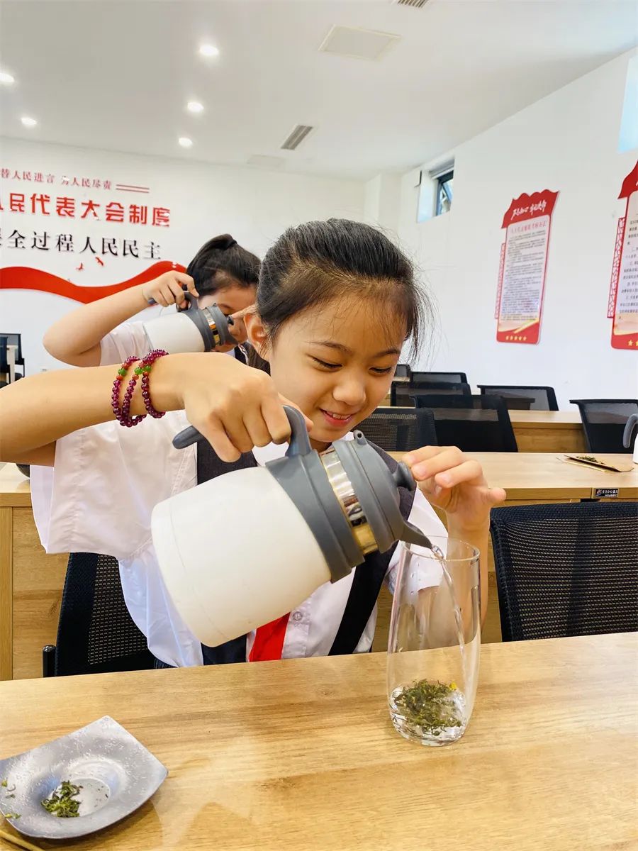 走進(jìn)茶藝廳,茶藝師簡單地向隊(duì)員們介紹茶藝展示的幾個(gè)步驟:行禮、溫器、請茶、洗茶、泡茶、分杯和奉茶等。聽完講解,隊(duì)員們立刻化身為一名名小茶藝師,在老師的帶領(lǐng)下,一起學(xué)習(xí)茶禮,傳承茶道,感受中華傳統(tǒng)文化的魅力。
