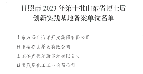 近日,日照嵐星化工有限公司、日照圣谷山茶場有限公司、山東圣克萊爾新能源有限公司、山東萬澤豐海洋開發(fā)集團(tuán)有限公司4家企業(yè)被認(rèn)定為山東省博士后創(chuàng)新實(shí)踐基地備案單位。